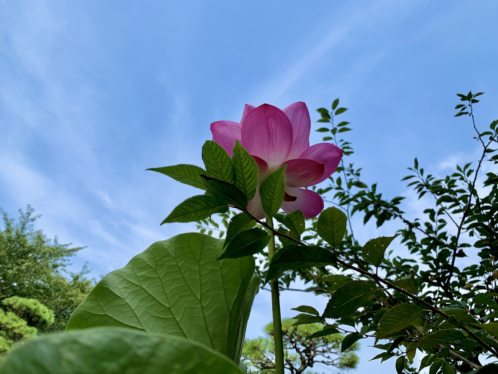 蓮の華が天高く伸び、空へむかって咲いています。