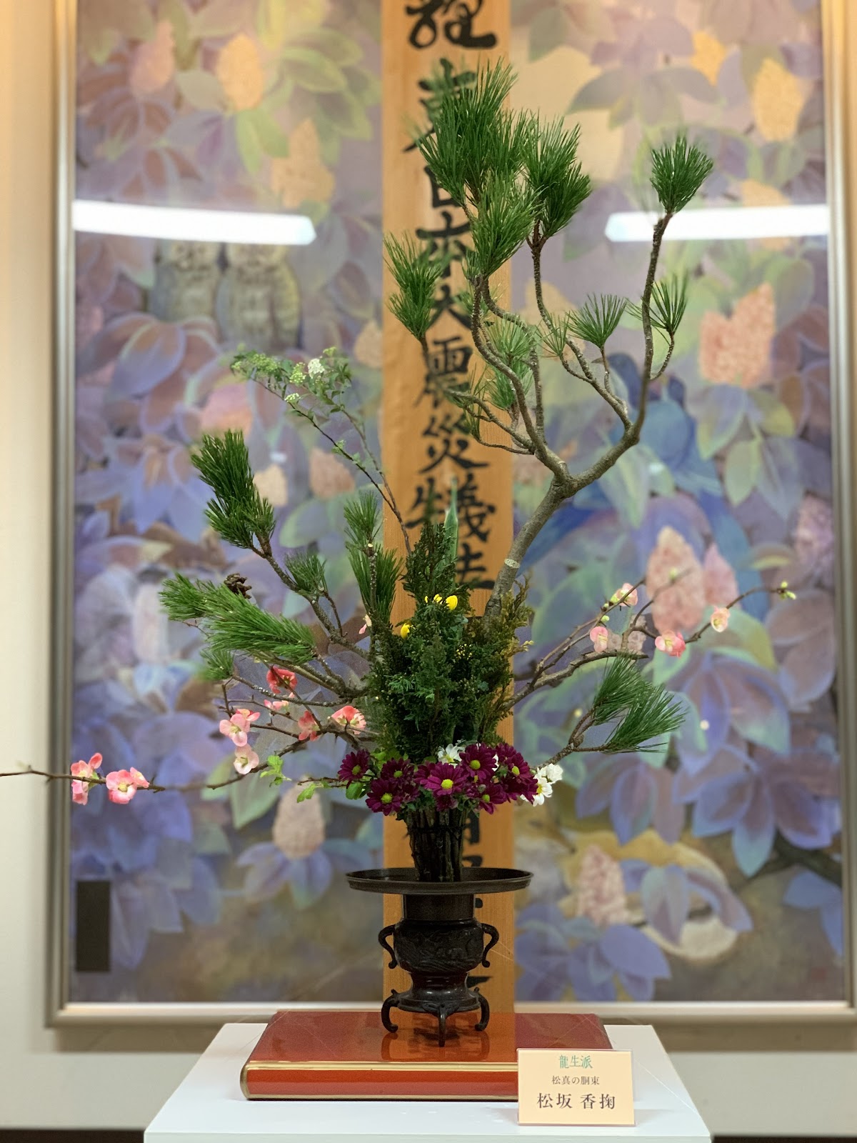 龍生派は古典華と自由花の二つのいけばなの手法を護持し、その両方でそれぞれの個性の表現を目指す流派です。「立花(りっか)」と「生花(せいか)」の高次での融合、表現を伝承して現代に伝えておられます。まさに「個性表現のためのいけばな」です。