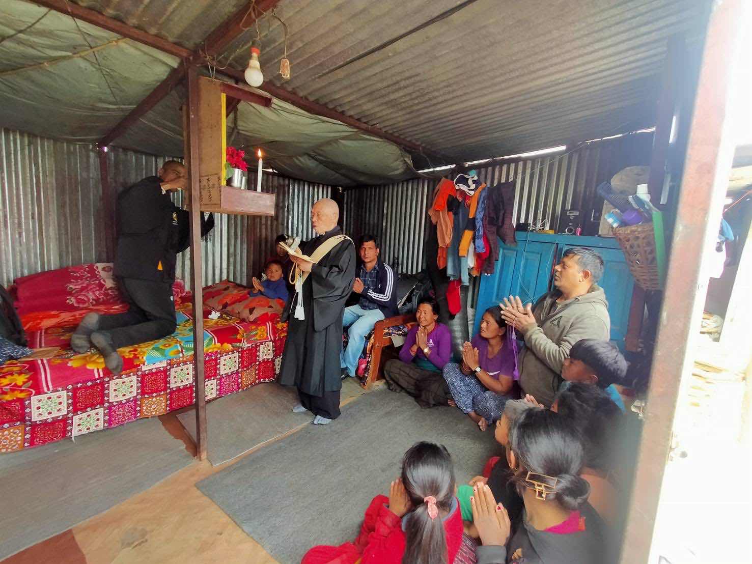 ④18日、チリンの実家に御本尊無事奉安〈学校の先生はじめ近所の方々も集まり大勢でした〉。昼の食べ供養もいただきました。帰り道、ナンダクマルーグルー宅お助行。別院帰山後、チベット僧侶参る。
