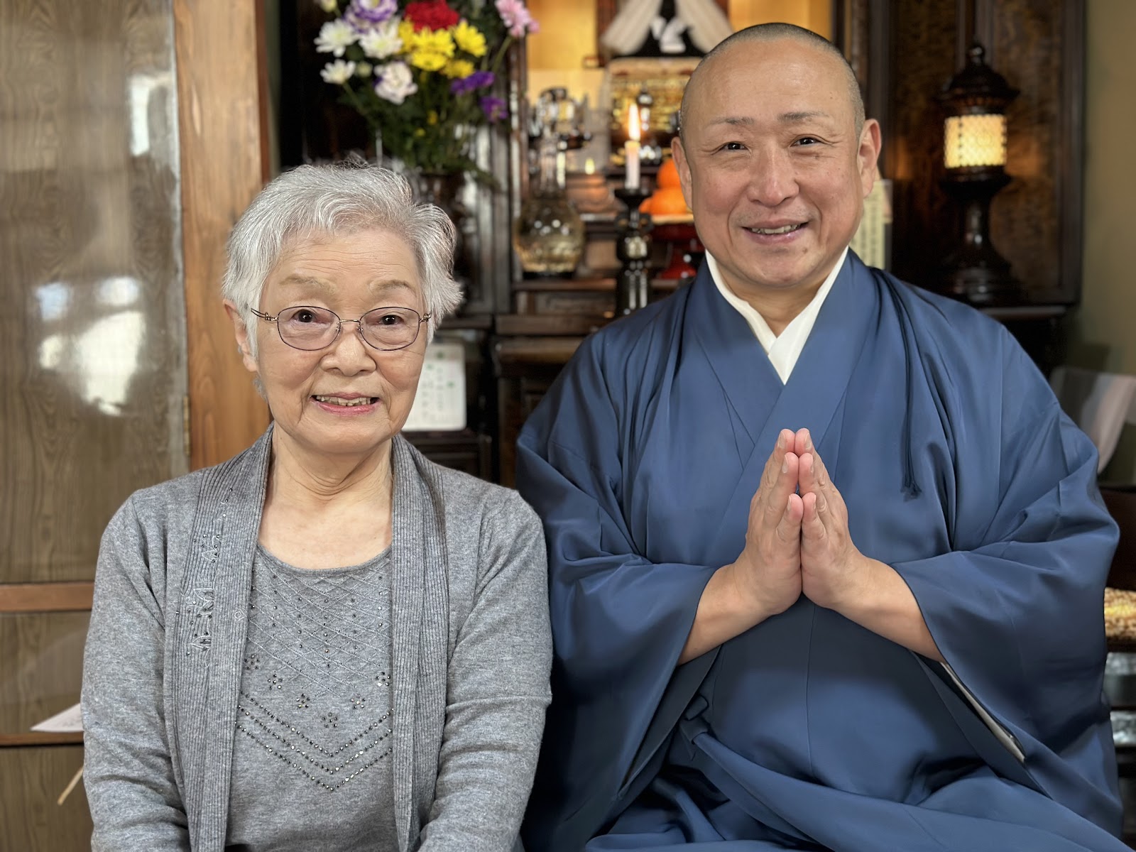 今日の御講ではお席主のお母さま、君代さんと記念写真。往年の名教区長だった君代さんは7月で92才、お肌がピチピチで本当に若々しく、まったく年齢が分かりませんー。「ドモホルンリンクルやSK-IIのコマーシャルにいつでも出れるよー(笑)」とみんなで盛り上がりました。