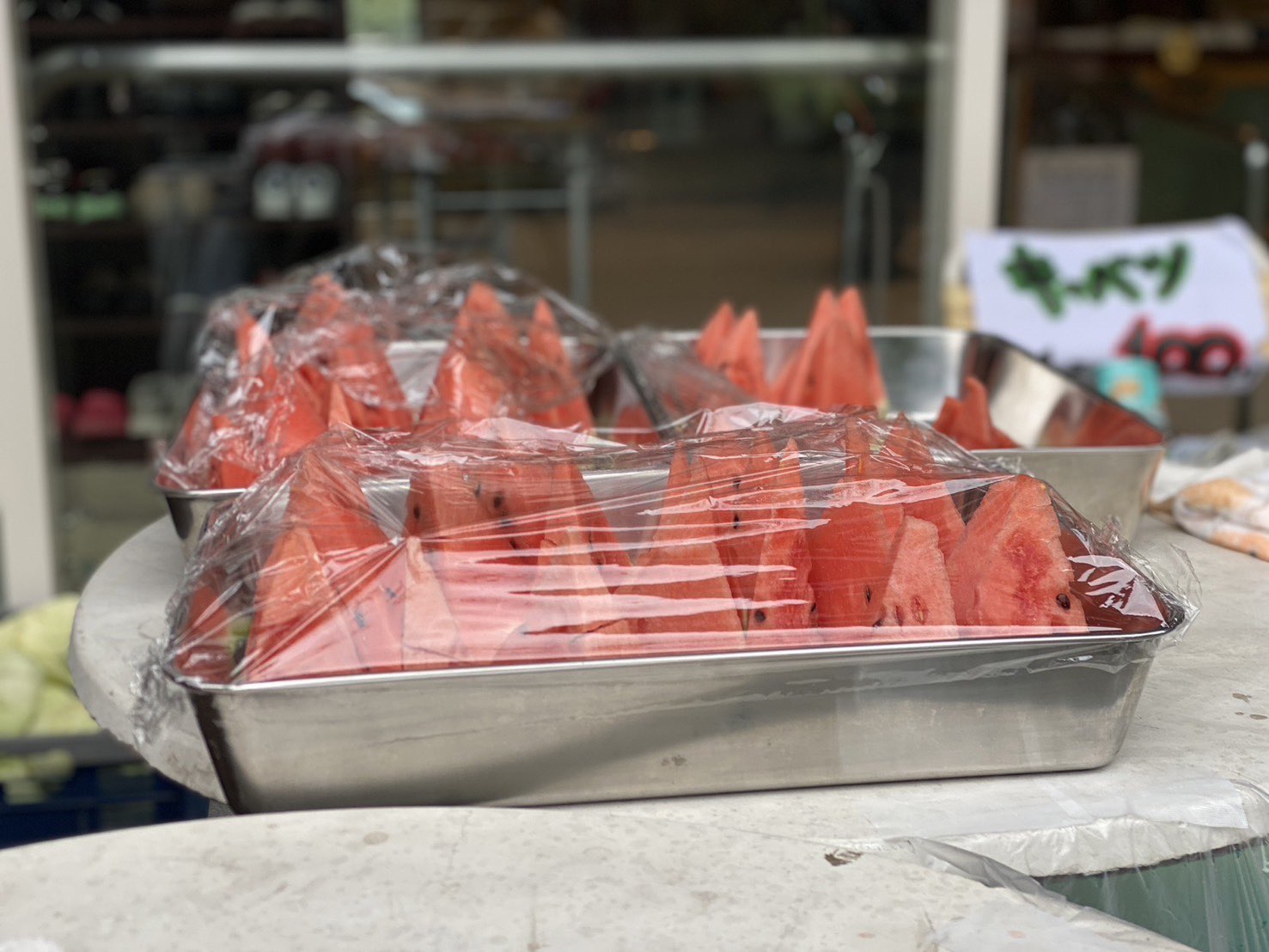 今朝は夏期参詣にお参りくださる皆さまに門前でスイカのご供養。黒崎卓さまからお預かりいたしました。亀田谷さんからはいつもながら練馬産の無農薬野菜、大量のキャベツをご有志いただき、皆さまにお配りしております。