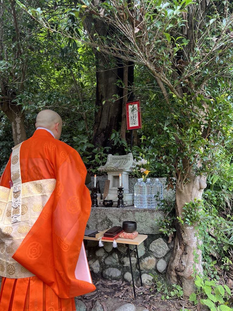 朽ちかけた巨大な老木の下に小さな祠があり、古いお札を下げ、その中央上部に御本尊をご奉安させていただきました。ご両親をお教化したいという小百合さんの想いもあり、お母さまやご親戚、ご友人にもお参りいただき、本門佛立宗の正式なご回向の一座。