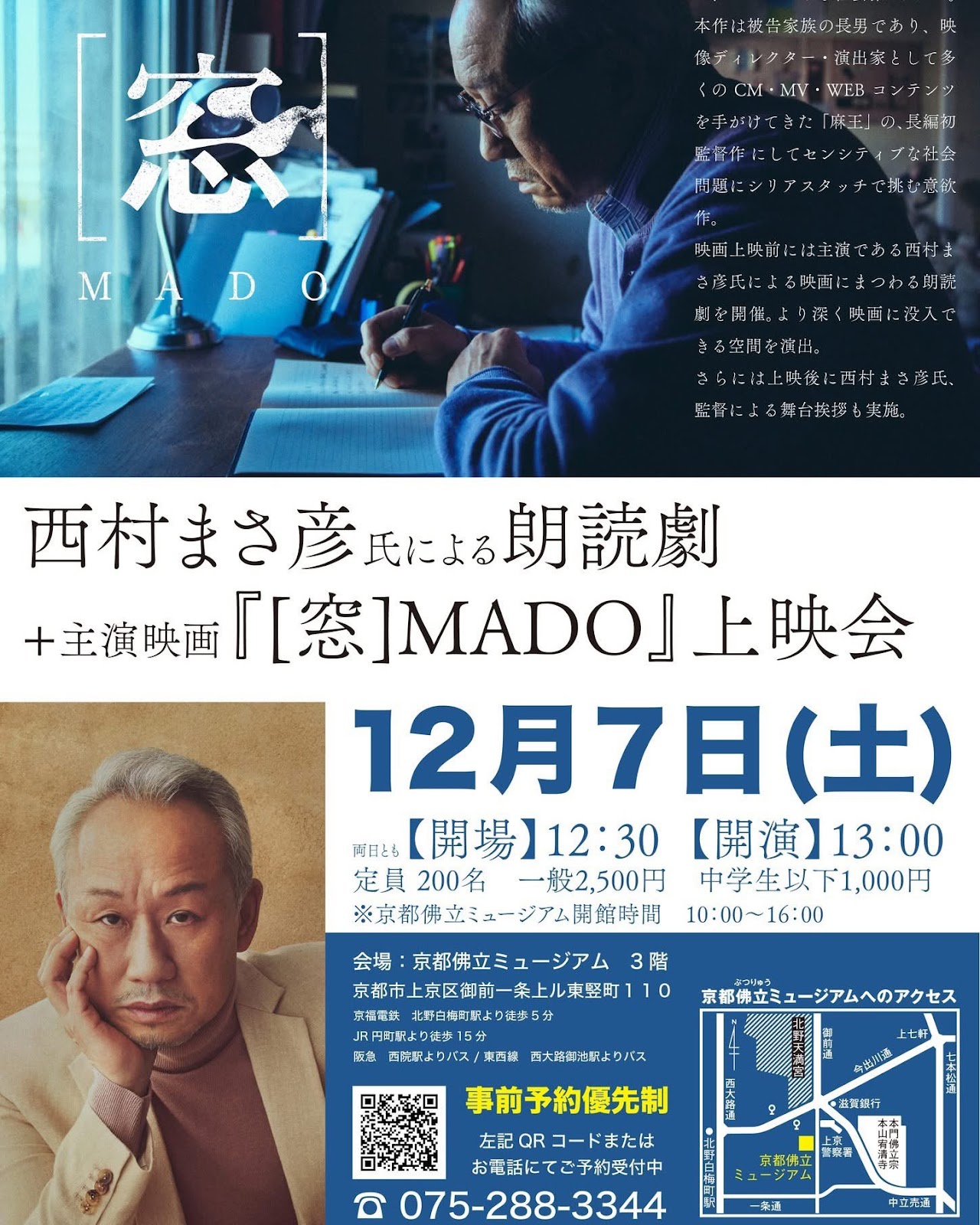 国際映画祭で数々の賞を受賞している映画「窓MADO」の上映会を開催し、そこに日本を代表する名優のお一人、西村まさ彦さんが京都北野に来てくださいます。こんな貴重な機会はめったにございません。上映に先立ち、西村さんに朗読劇をしていただきます。素晴らしいです。この映画を何倍も深く味わうことができます。