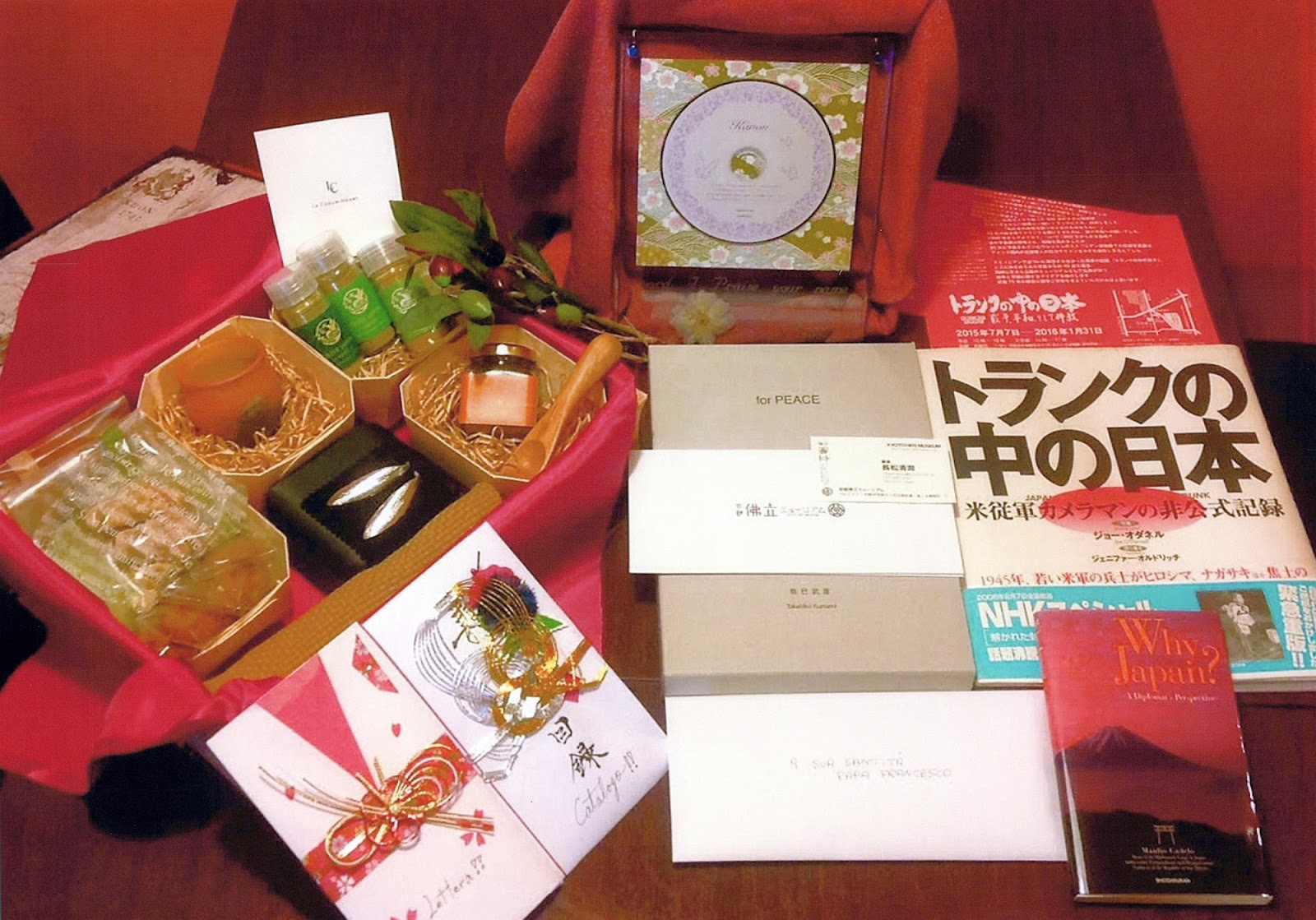 10年前、終戦70年、京都佛立ミュージアムは「トランクの中の日本 〜戦争、平和、そして仏教展〜」を開催し、この際、伊東満所顕彰会の方々が「焼き場に立つ少年」を中心とした『トランクの中の日本』やミュージアムのパンフレット、私の名刺などを、教皇フランシスコに届けてくださいました。