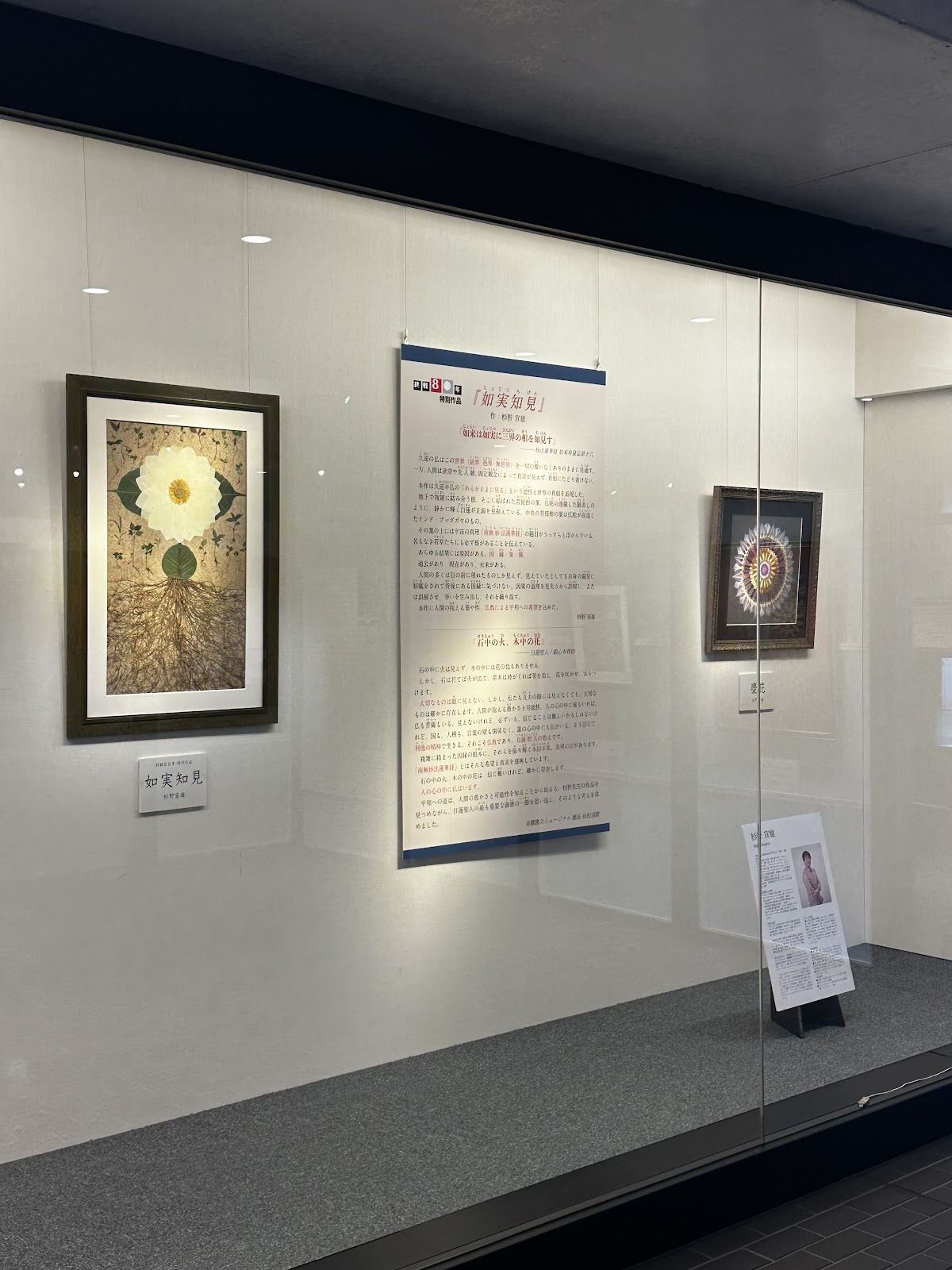 そして、壁面ガラスケースには杉野宣雄先生による終戦80年特別作品を展示しています。青い睡蓮とクレマチスを用いた「慶花」。この宇宙の普遍性を示す曼荼羅のような作品です。